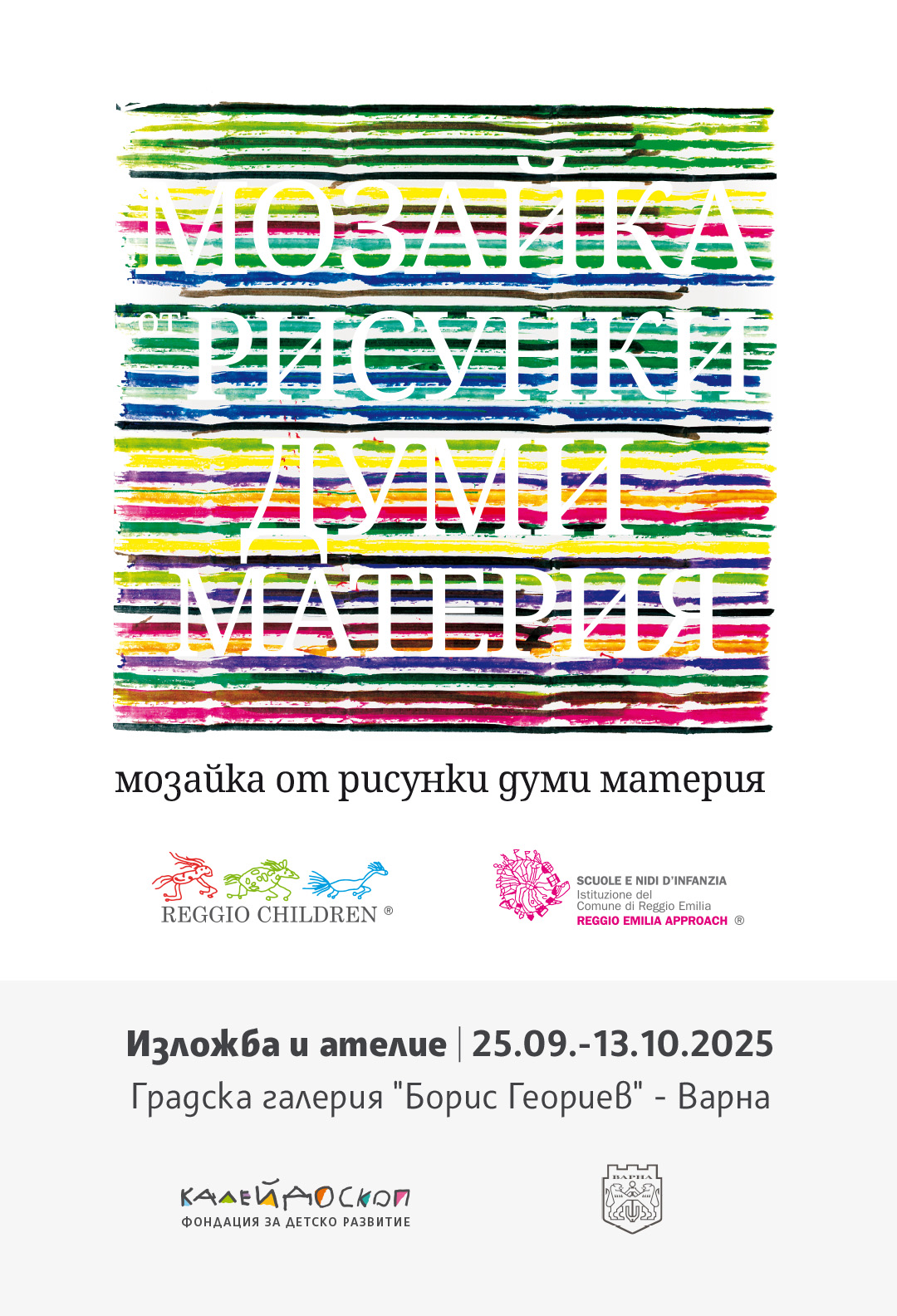 Изложбата е на Reggio Children и италианския град Реджо Емилия, прочут с една от най-добрите раннообразователни системи в света. Изложбата започва своя път от Италия през 2014 г. и междувременно е преминала през САЩ, Канада, Австралия, Япония, Сингапур, Кувейт, Мексико, Перу, Бразилия, Австралия. Представянето в България е възложено на фондацията за детско развитие Калейдоскоп. На 25.09.2025 Мозайката ще преобрази третия етаж на Градската художествена галерия в празник на сетивата и въображението. Мозайка от рисунки, думи, материя не излага детски творби, а изследва връзките между рисуването, думите и материалите. В двадесетте изложбени пана се преплитат истории, рисунки и следи, оставени върху върху хартия, камък, пластмаса. Проследяваме как човекът си служи с тези елементи в зората на детството, за да изразява себе си, да взаимодейства с другите и да конструира знания - поясняват от фондация Калейдоскоп. - Създаваме спонтанни (но не случайни) моменти и преживявания, които се свързват в нещо по-голямо и сложно: когнитивното и културно богатство, с което се откроява човешкият вид. Изложбата отправя поглед към детето като творчески изследовател, който изгражда себе си в диалога с другите и материалната среда. Едновременно с това, тя е и покана посетителите да събудят детето у себе си: да преоткрият материали от всекидневието като хартия или пластмаса през радостта от докосването, взаимодействието, експериментирането и измислянето.